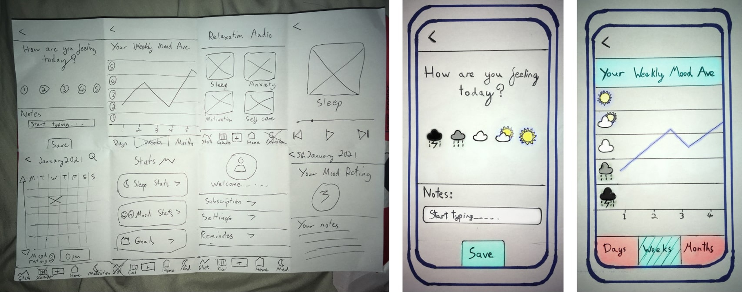 The theme to represent moods would be weather icons instead of faces or numbers. The idea originated from a Steven Fry quote: “mood is like your own personal weather”.