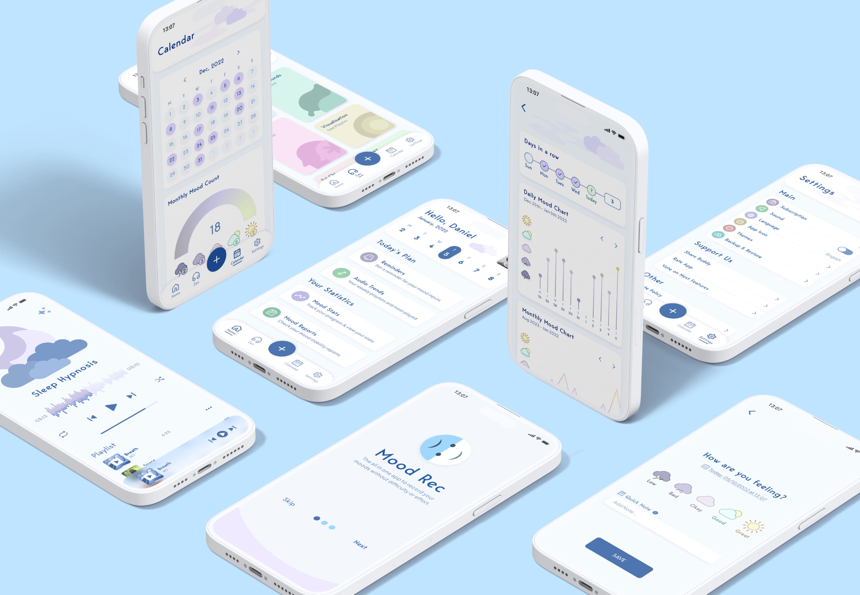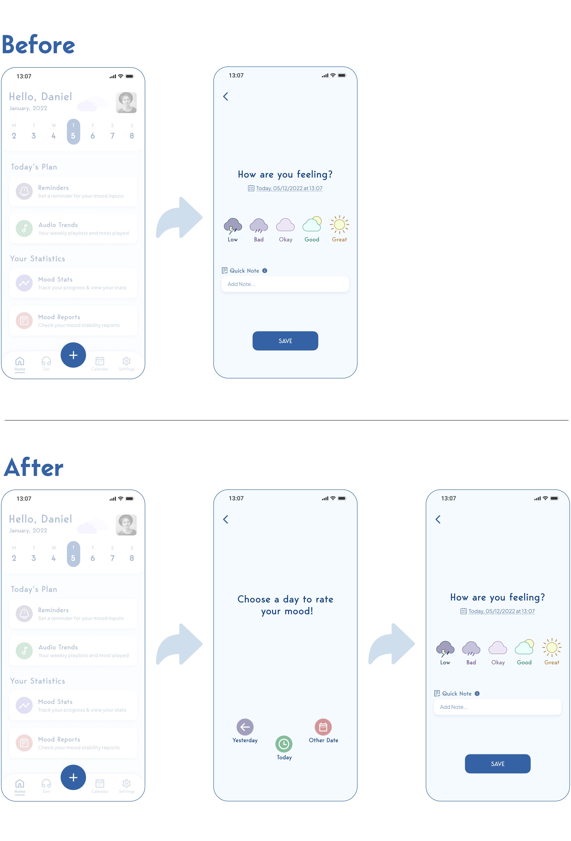 Users struggled to log moods quickly and navigate the app efficiently. I redesigned the core flows to make the experience more intuitive, accessible, and engaging.
