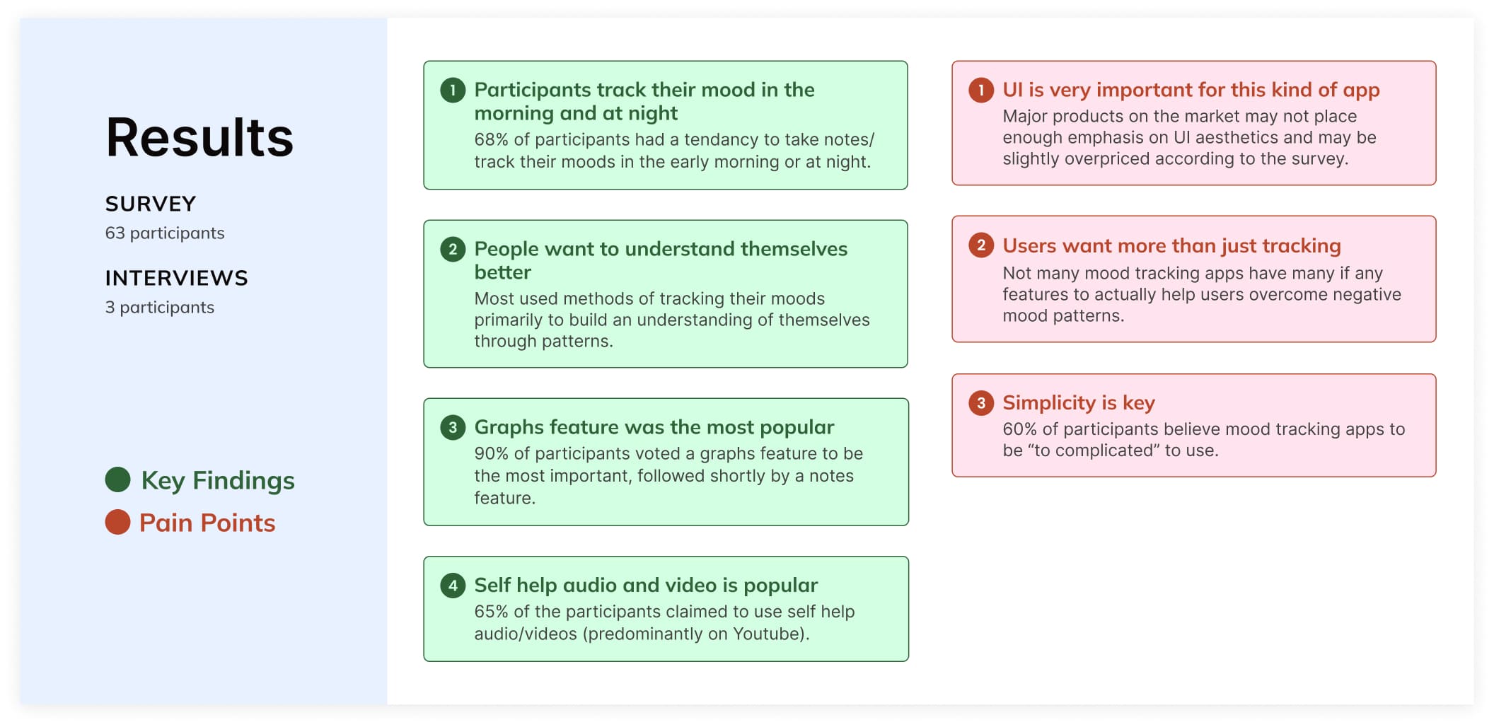 I was interested in exploring opportunities in mood tracking wellness products. I interviewed 3 people who had used mood tracking digital products, and surveyed a total of 63 adults. The purpose was to find clear evidence backing what users look for in mood tracking apps, pain points, and what current apps may be missing. The results would contribute to some of the final products key features.