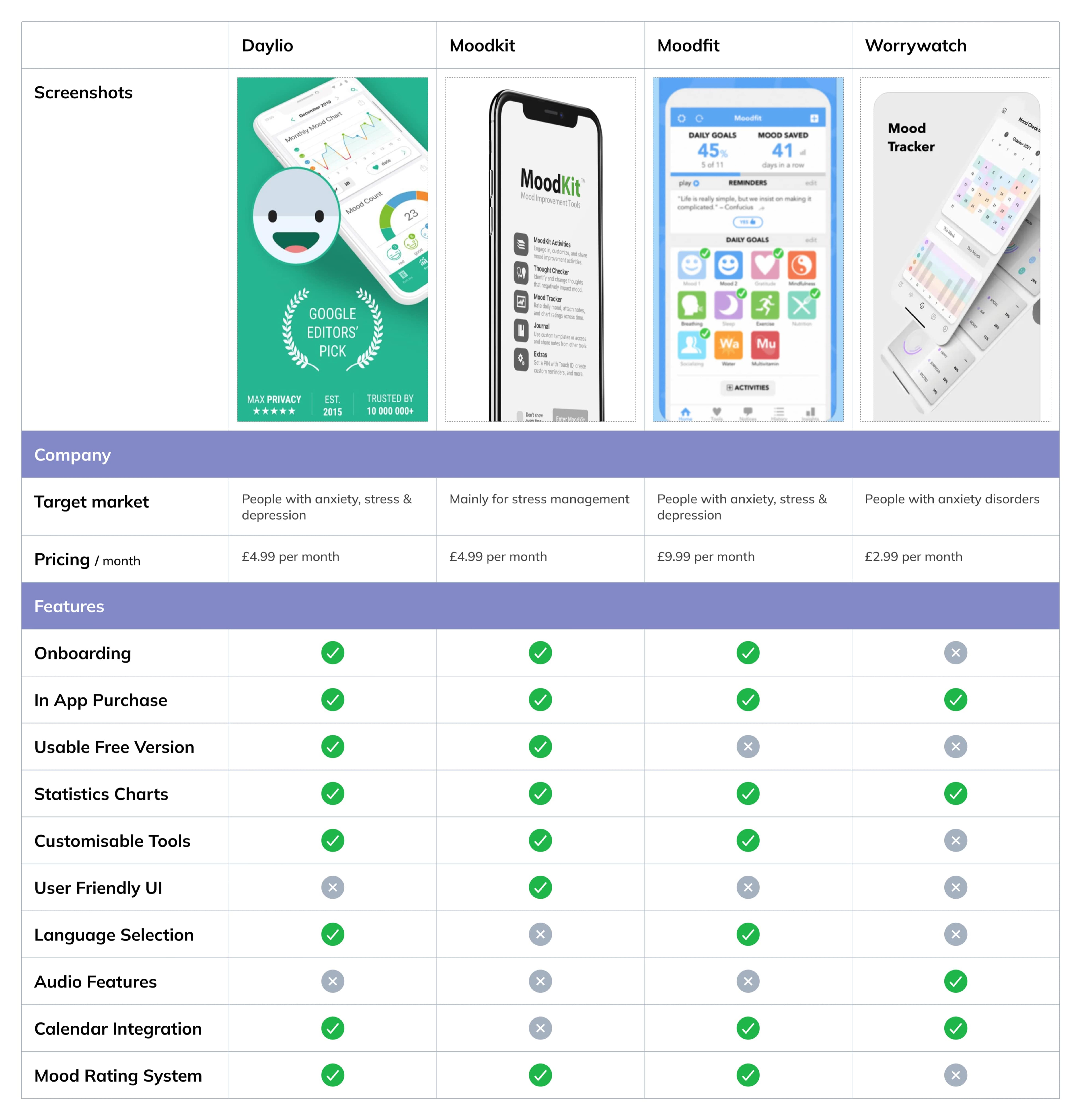 The applications that I found (see below) are the most successful current mood tracking apps on the market. I analysed the different features, reviews and specs of each and came up with a list of pros and cons.