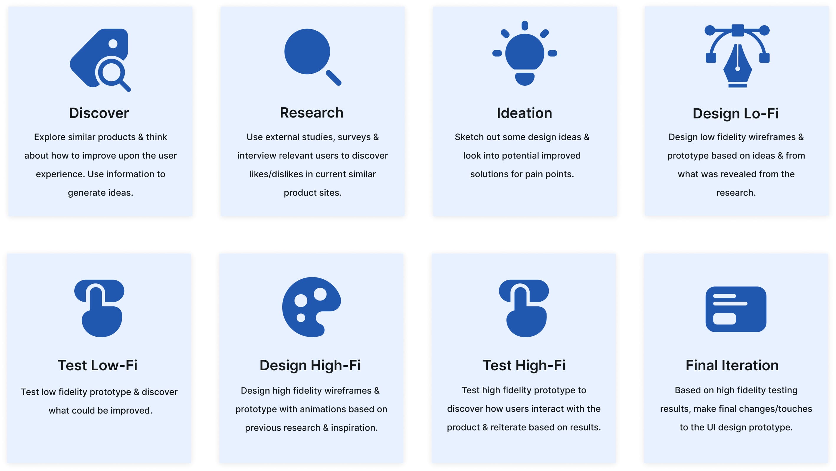 Every project is different and my process will continue to evolve. It will be determined by the goals of the project, the problem/problems that need to be solved, time and resources.