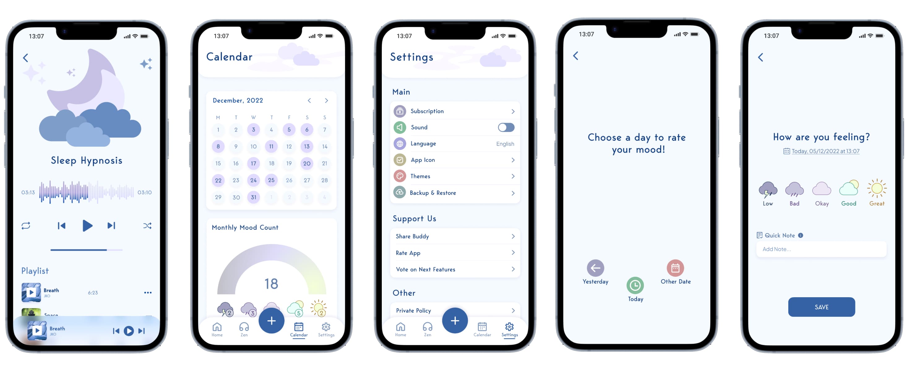 I have arranged some of the main feature screens for viewing, as well as the final prototype. One of the features I have primarily focused on improving the user experience for the "Zen" (audio section) of the app. Some of the data from the research indicated that most people turned to Spotify and Youtube when they are feeling down for calming music/meditation audio. This is also a feature that makes this product unique as there are no other mood tracking wellness apps that provide this. Here is a brief description of the 5 main navbar features:
