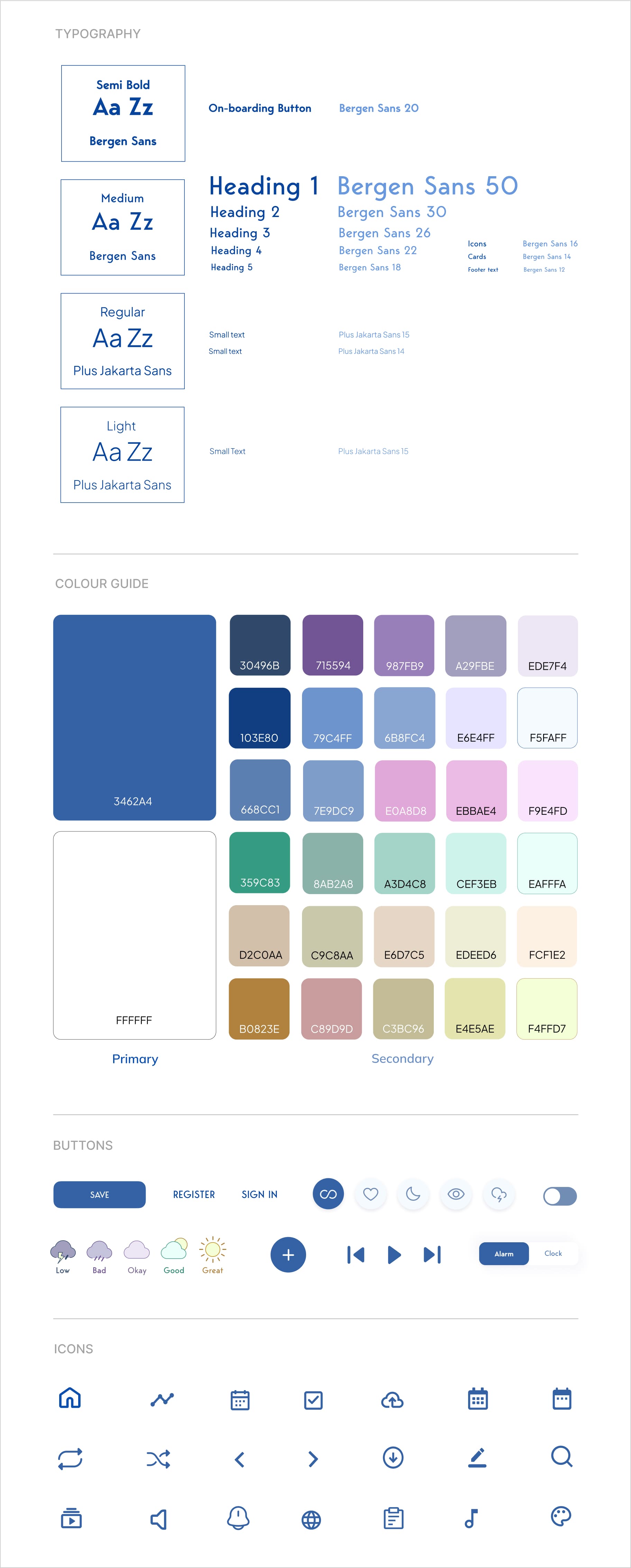 This is a style guide for Mood Rec mobile application. This style guide contains colors, typography, buttons, and icons: