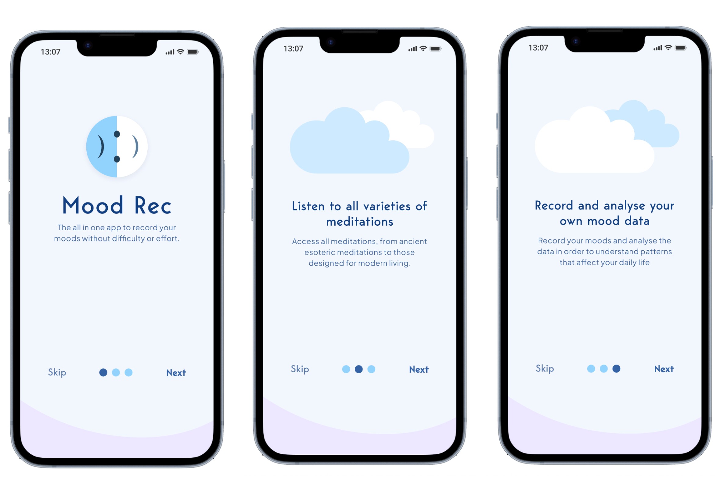 Mood Rec is an app that will provide a complete suite of services for people who would like to track their daily moods in order to expose patterns in their thinking. Some of the services will include a mood rating system, diary, mood data statistics, calendar and an audio wellness page.