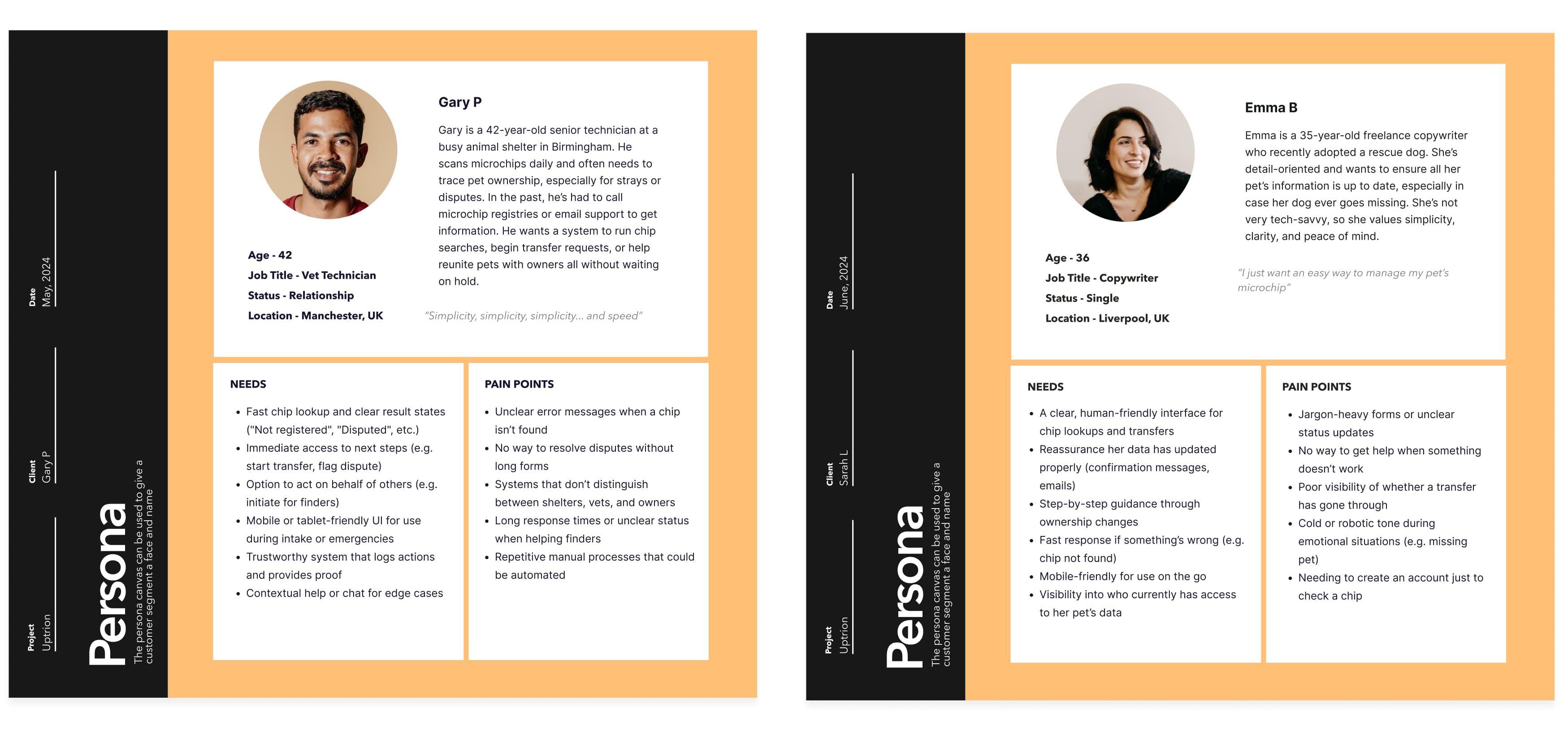 Before defining solutions, I created user personas representing the most common and critical user types. These guided decisions across interface design, content tone, and flow logic.