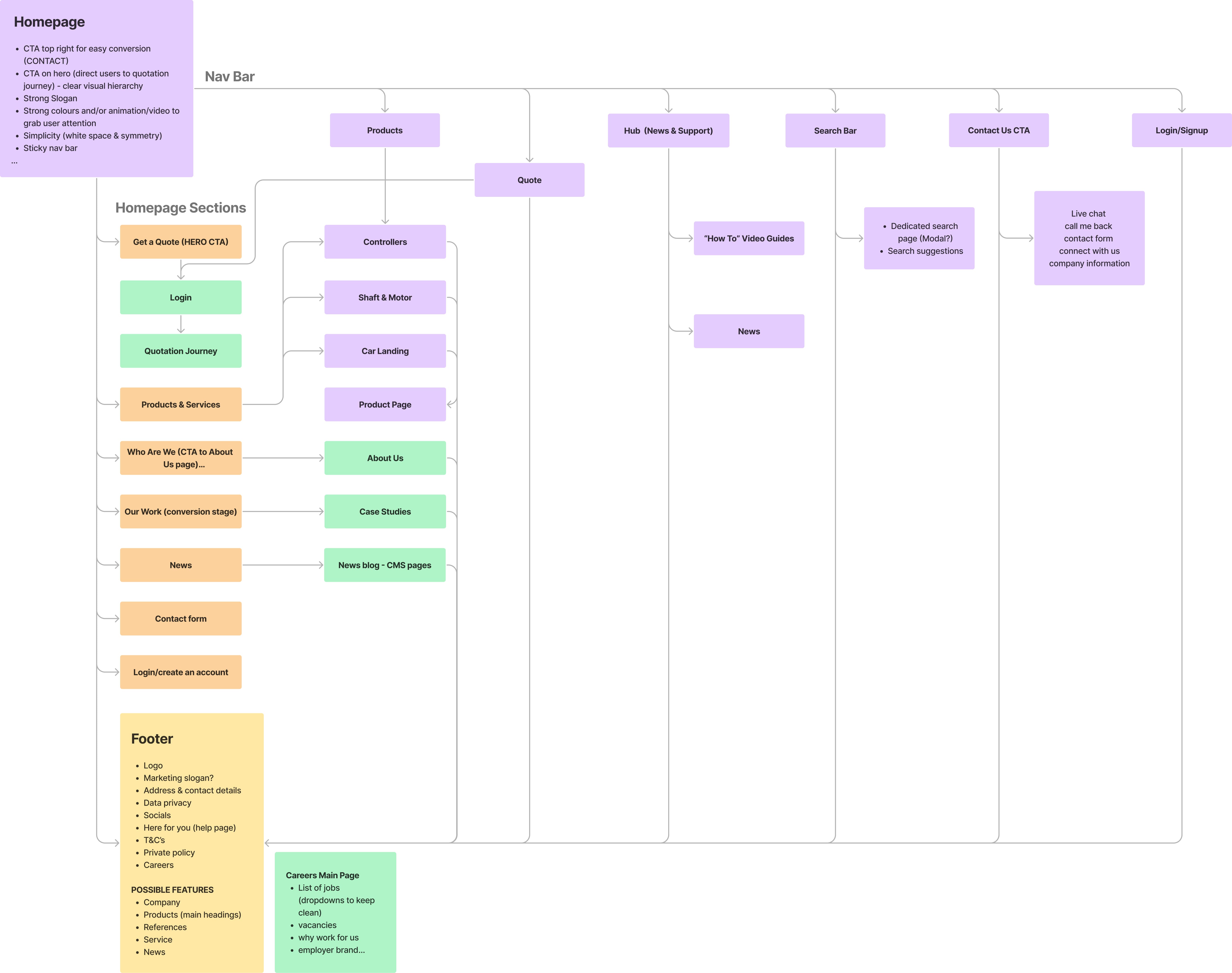 In order to better understand key objectives, user expectations, marketing strategies, and usability standards for this project, I conducted a competitive analysis of similar websites. I initially reviewed direct competitors in the lift and elevator control systems space, but quickly found that many of their quote processes were either outdated or extremely technical.