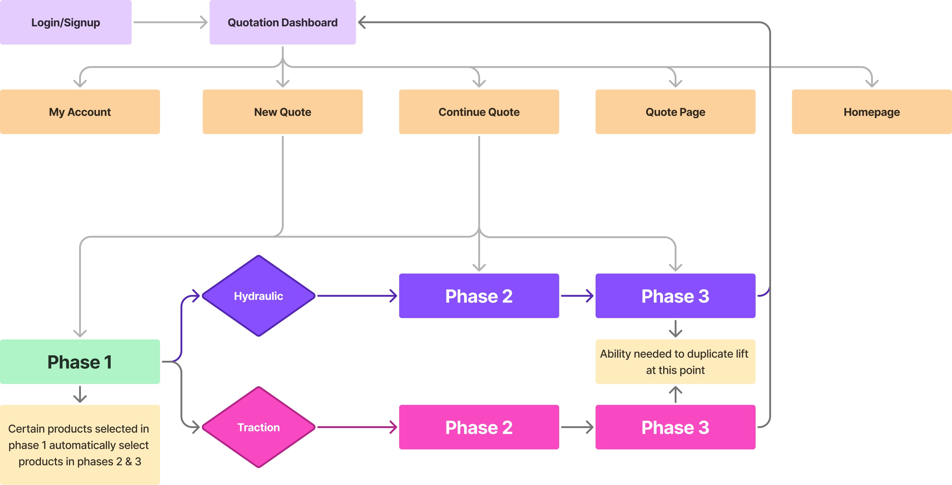 After recovering from those engineer sketches, I focused on clarifying the quote flow. Working closely with the client, I redesigned the journey into a guided three-phase process that helps users confidently build an accurate lift configuration.