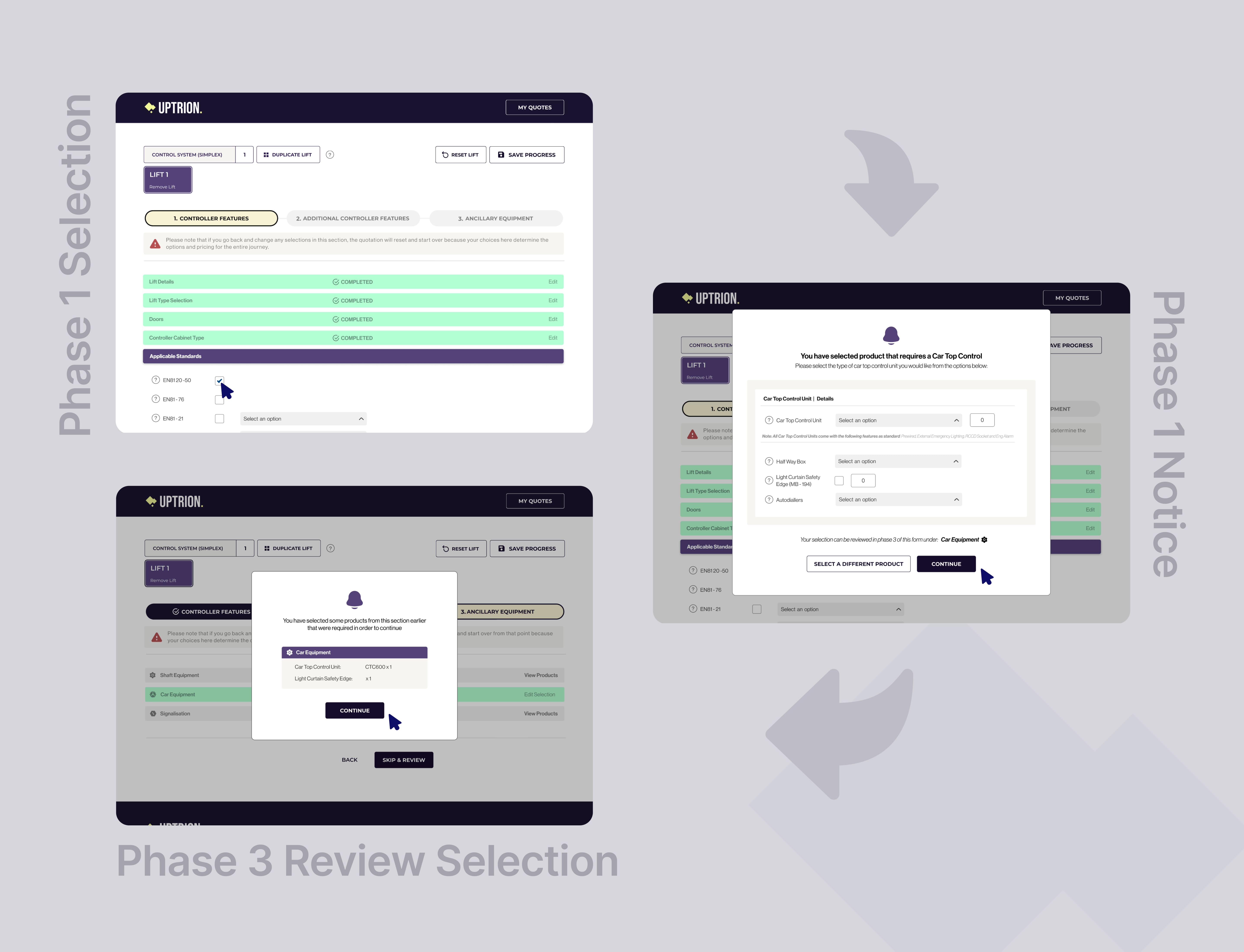 To manage complex dependencies between lift configuration phases, I introduced modals that alerted users when a selection required a product in a later step (e.g., selecting Product A would require Product B later). These modals provided clear options to continue or go back, while visual cues and color reinforced awareness of earlier choices throughout the journey, helping users make informed decisions and reducing errors.