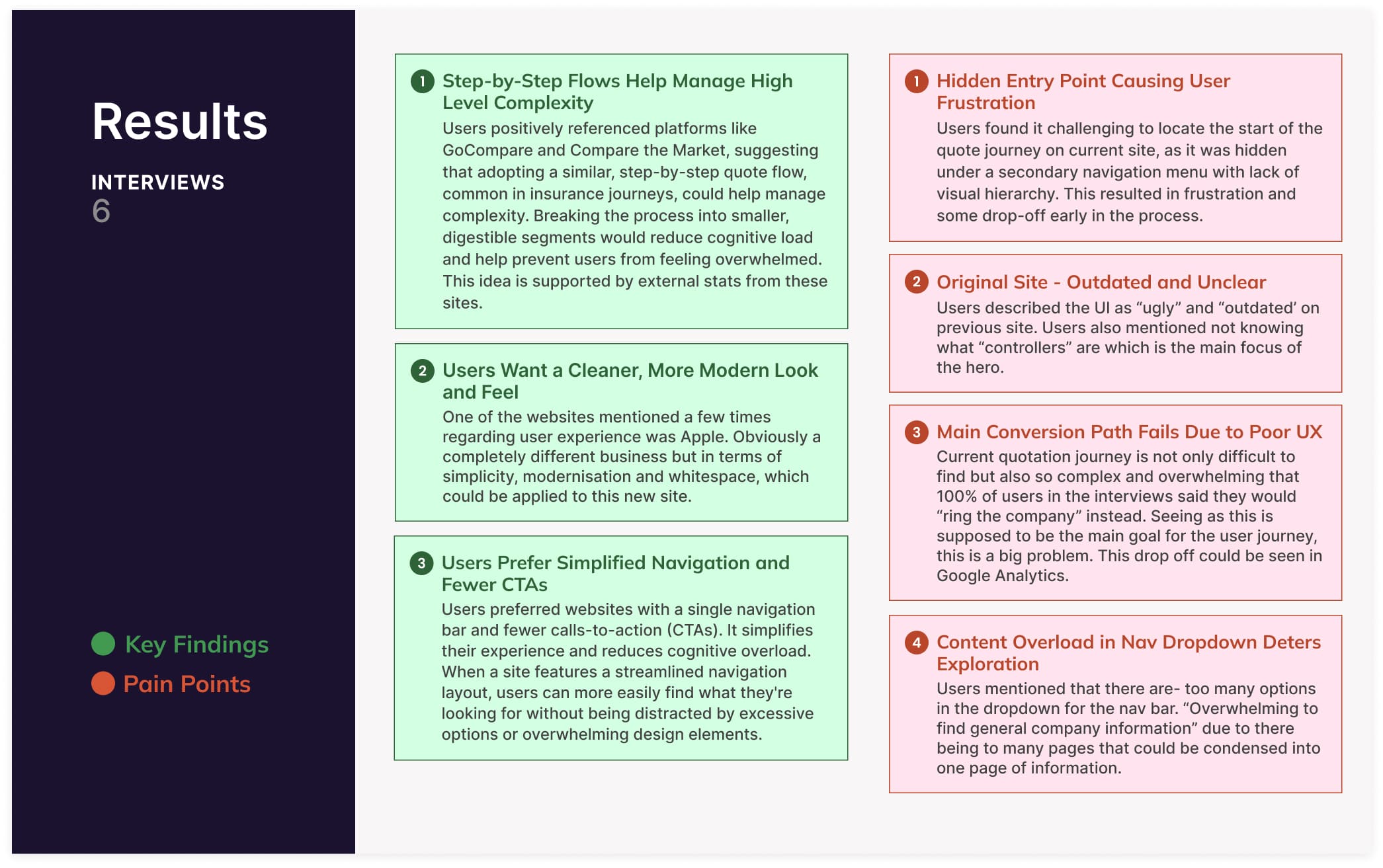 Interviews revealed a series of key findings and pain points, which you can see summarised in the following results.