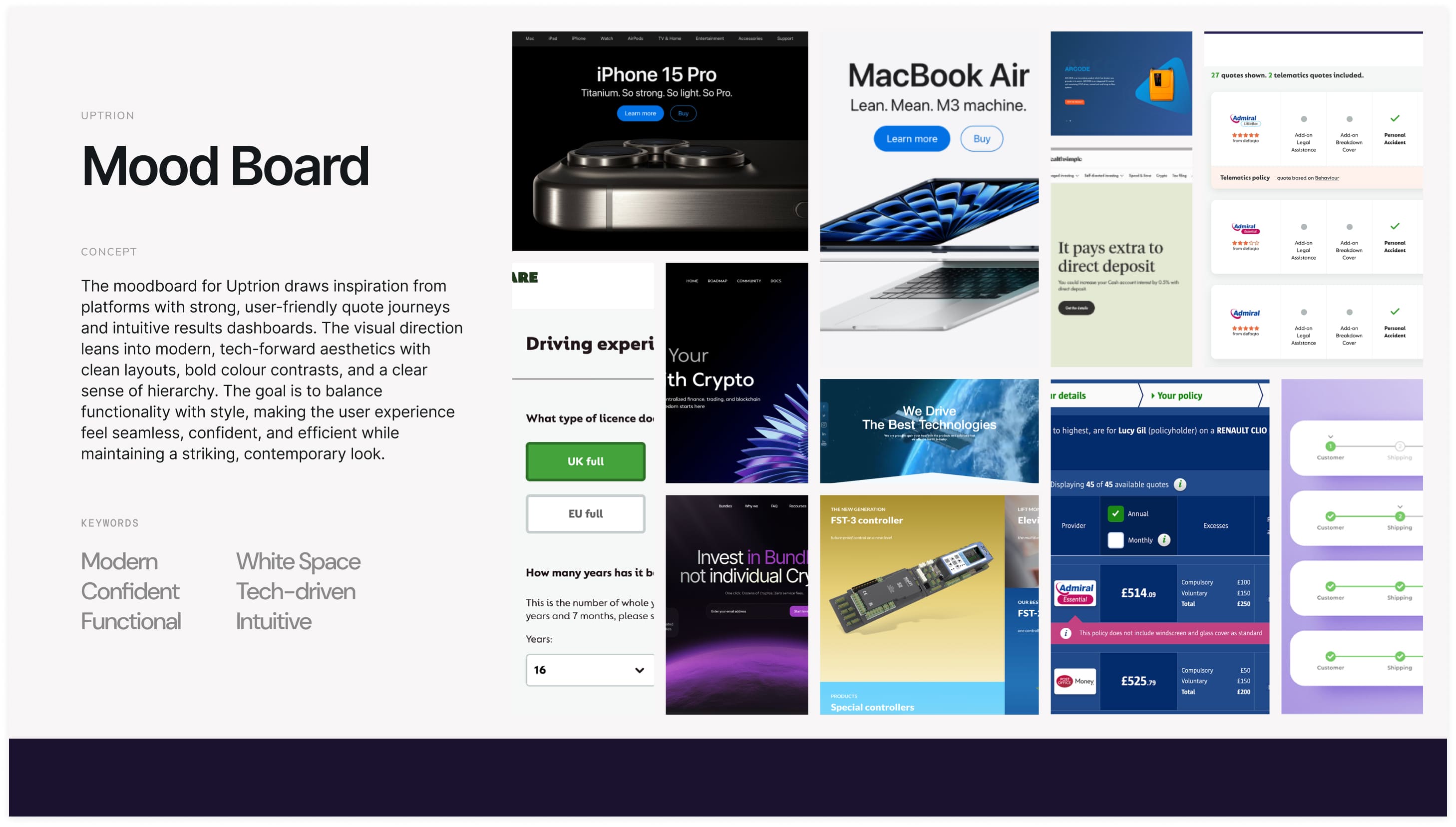 To expand my research, I later explored quote-heavy industries like insurance (e.g. GoCompare), where complex journeys are broken into simple, step-by-step flows, a useful model for tackling Uptrion’s technical process.